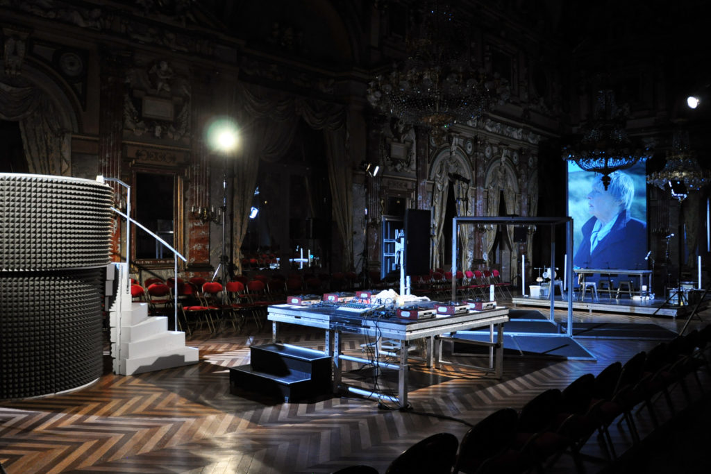 Enkele minuten voor aanvang wordt de zaal in complete duisternis gehuld, en door de koptelefoons die we bij het betreden kregen aangereikt klinkt bovendien een oorverdovende stilte. Stilte voor de storm, want het komende uur word je als kijker meegezogen in een razende opeenvolging van audio- en videofragmenten, een chaotische dramaturgie en een veelvuldig gelaagd klanklandschap van geluidskunstenaar Ruben Nachtergaele.