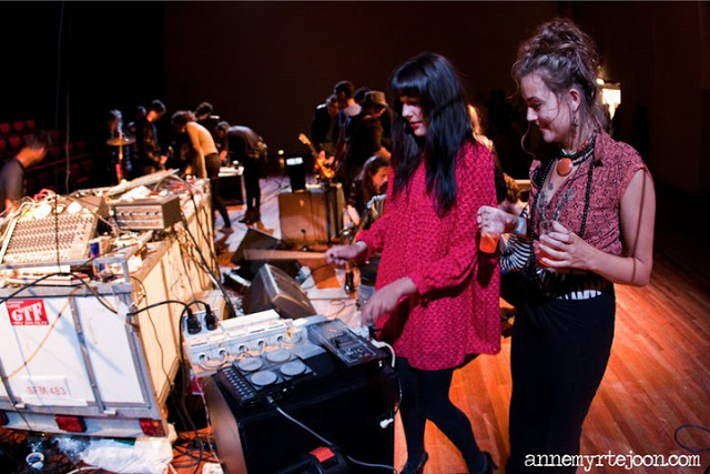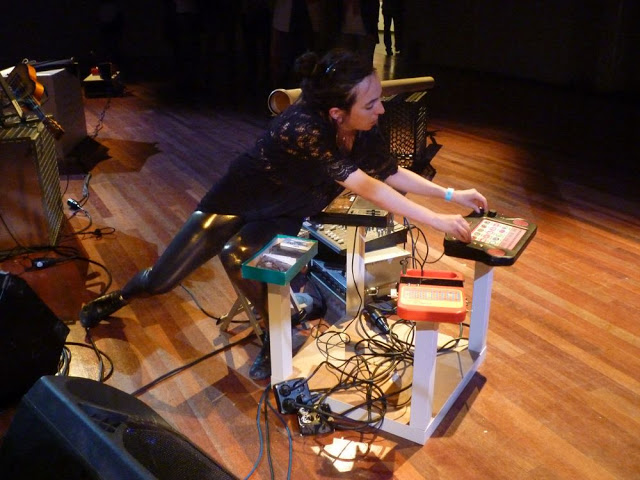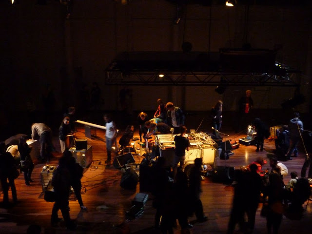 ” De avond begint logischerwijs bij De Brakke Grond, na het afhalen van de passe-partouts. Met verse polsbandjes en een nuchter hoofd bestormen mijn gezelschap en ik het Vlaamse cultuurhuis voor een impressie van de tien uur durende jamsessie in de grote zaal, met het publiek als muzikant, onder leiding van de leden van de Vlaamse band Kapotski. Niets haalt het kind in je naar boven als een keyboard van de speelgoedwinkel en een paar oude draaitafels, dat bewijzen de bezoekers. Het resultaat klinkt af en toe ook echt ergens naar, dankzij de ijverige geluidsmannen. Een geslaagd kunstwerk om naar te kijken en aan mee te doen.”